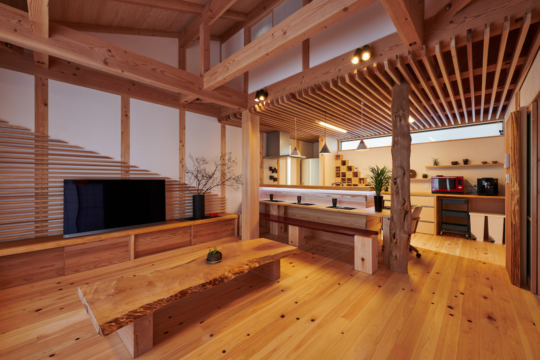 今回ご覧いただくのは、和と洋が融合した雨楽な家。和風のイメージをお持ちの方も多い雨楽な家ですが、テイストの自由度は実に幅広く、今回も驚くようなデザイン、アイデアをこれでもかと詰め込んでいます。