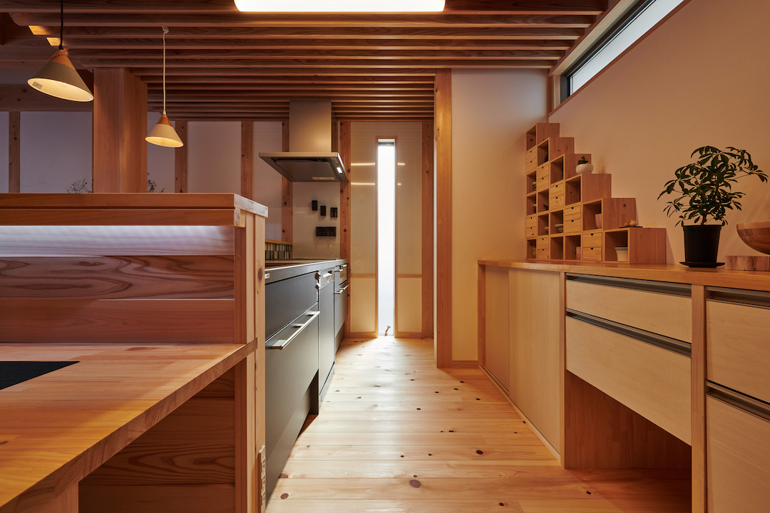 注目ポイントのひとつは無垢の板材。構造材や家具に無垢の木を使う西城建設の家ですが、今回はインテリアに無垢板を多用。リビングのテーブル、寝室の壁など、お施主様とアイデアを出し合い、他にはない特別な意匠の家に仕上がりました。