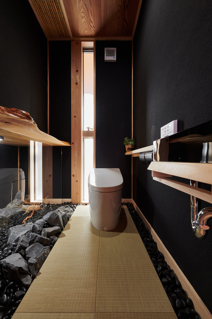 1、2階で異なる雰囲気のお手洗いにも注目。和モダンな1階、海辺をイメージした2階と、質感のある漆喰や壁紙、玉砂利を使用して、特別な空間をつくり上げました。