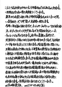でも、現場は職人の心意気で出来上がるものですので、一番大切な事はやっぱり職人さん達が気持ち良く働ける現場環境ですね。