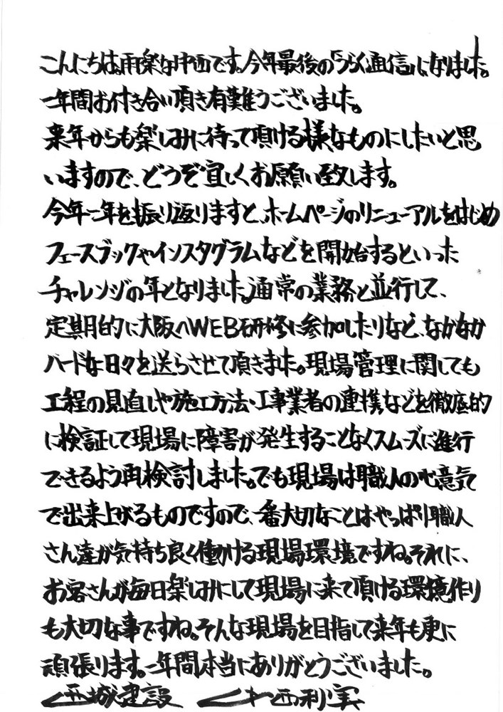 こんにちは。雨楽な中西です。今年最後の「うらく通信」になりました。