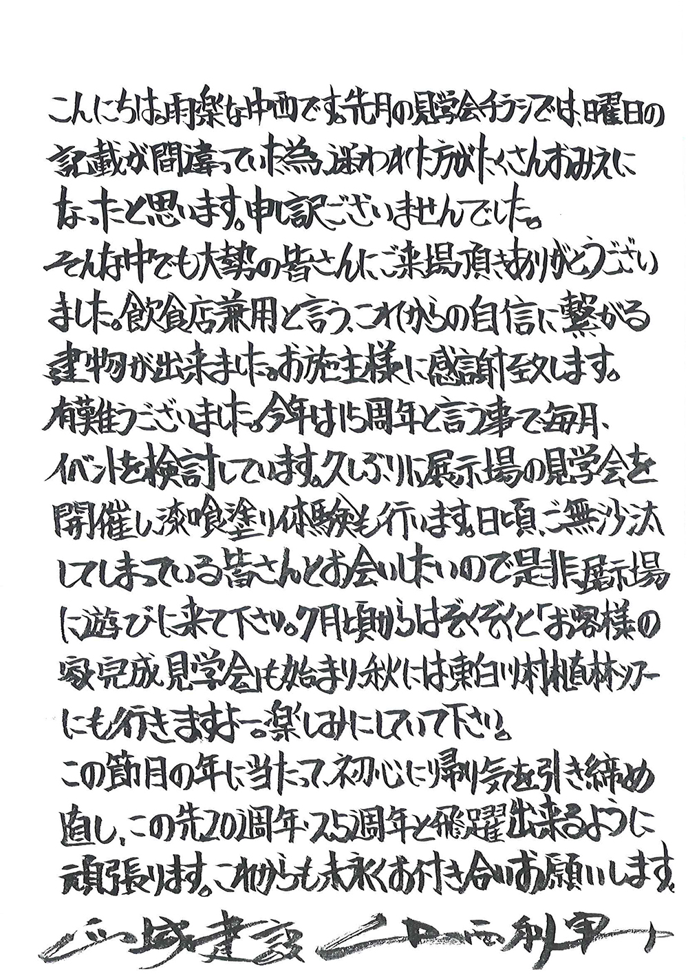 日頃、ご無沙汰してしまっている皆さんとお会いしたいので是非、展示場に遊びに来て下さい。