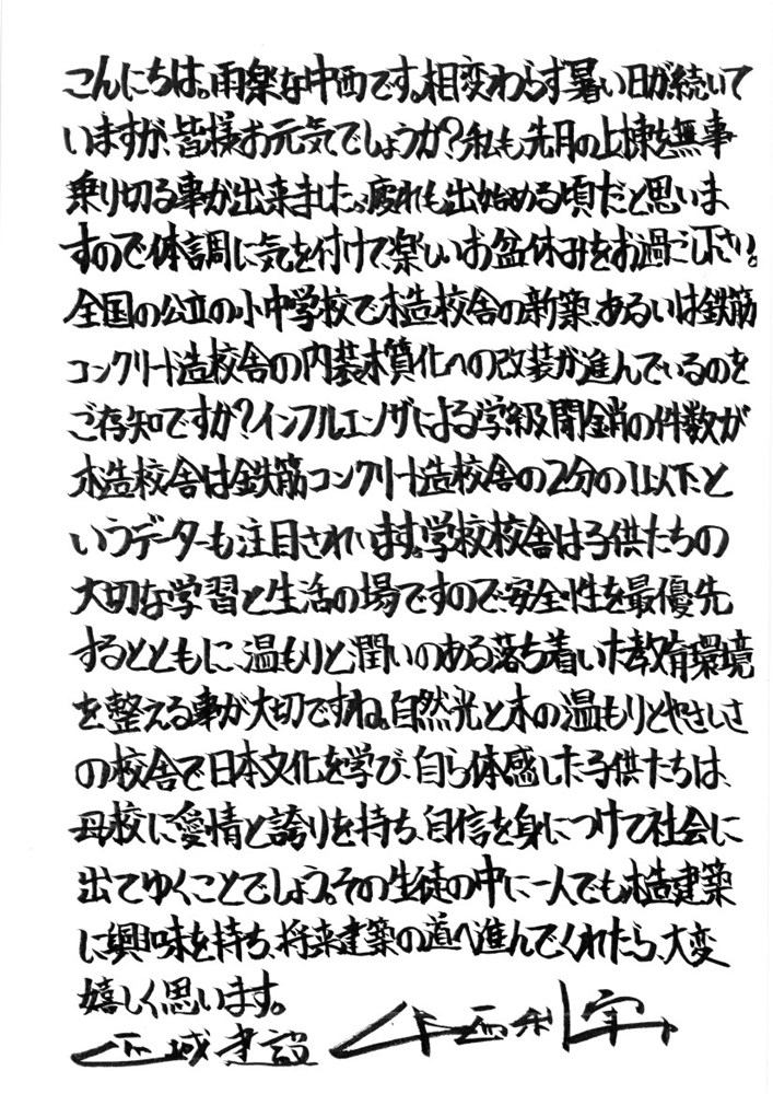 その生徒の中に一人でも木造建築に興味を持ち将来、建築の道へ進んでくれたら大変嬉しく思います。