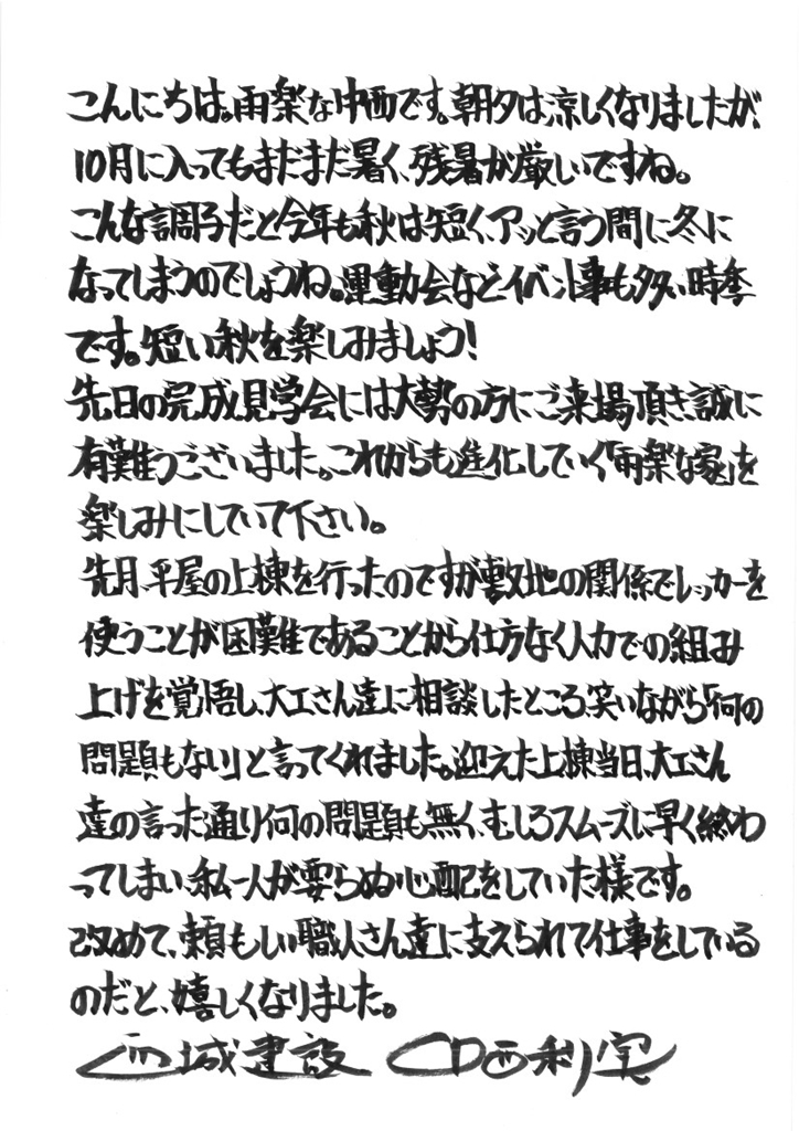 迎えた上棟当日、大工さん達の言った通り何の問題も無く、むしろスムーズに早く終わってしまい、私一人が要らぬ心配をしていた様です。
