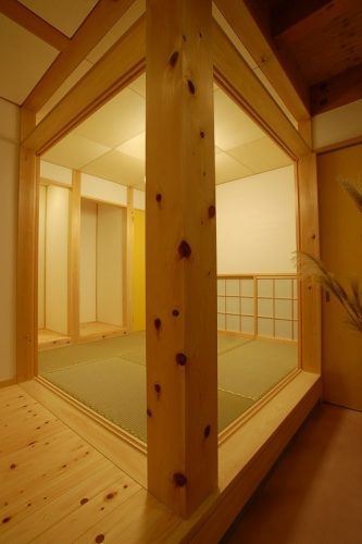 2~3センチの厚さの板木を接着剤で貼り合わせ、表面にヒノキの皮を施して1本の柱のようにしたもので、断面を見ない限り、一見、無垢の木と見分けがつきません。