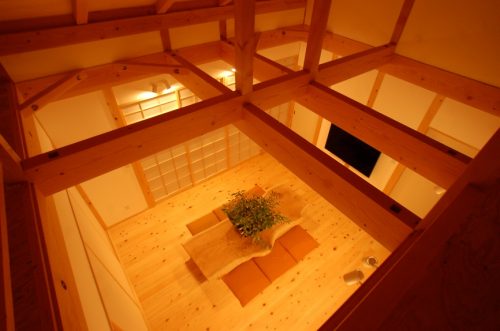 日本伝統の木架構構造(柱などの垂直材と、梁などの水平材で構成される建築構造)を見せる雨楽な家は、こうして木の持つ力強さを眺めることができるのも大きな魅力の一つです。