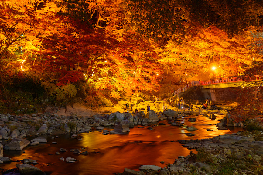 済んだ空気の中、川の流れを感じながら眺める赤や黄に染まった木々。