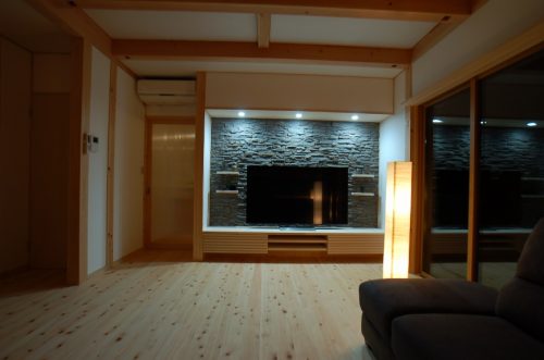 デッキなどを収納しておく造り付け家具、石の壁面のデザインは西城建設からの提案で、T様にも気に入っていただき、採用となりました。