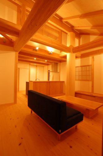 新たなチャレンジとは、大黒柱と梁に丸太を使ったこと。