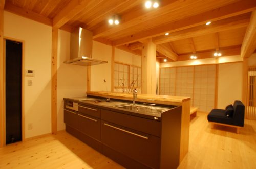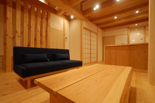 雨楽な家らしく、木架構構造(柱などの垂直材と、梁などの水平材で構成される建築構造)の美しさが際立つこの家ですが、実は構造材の組み方に宮大工の知恵が注がれています。
