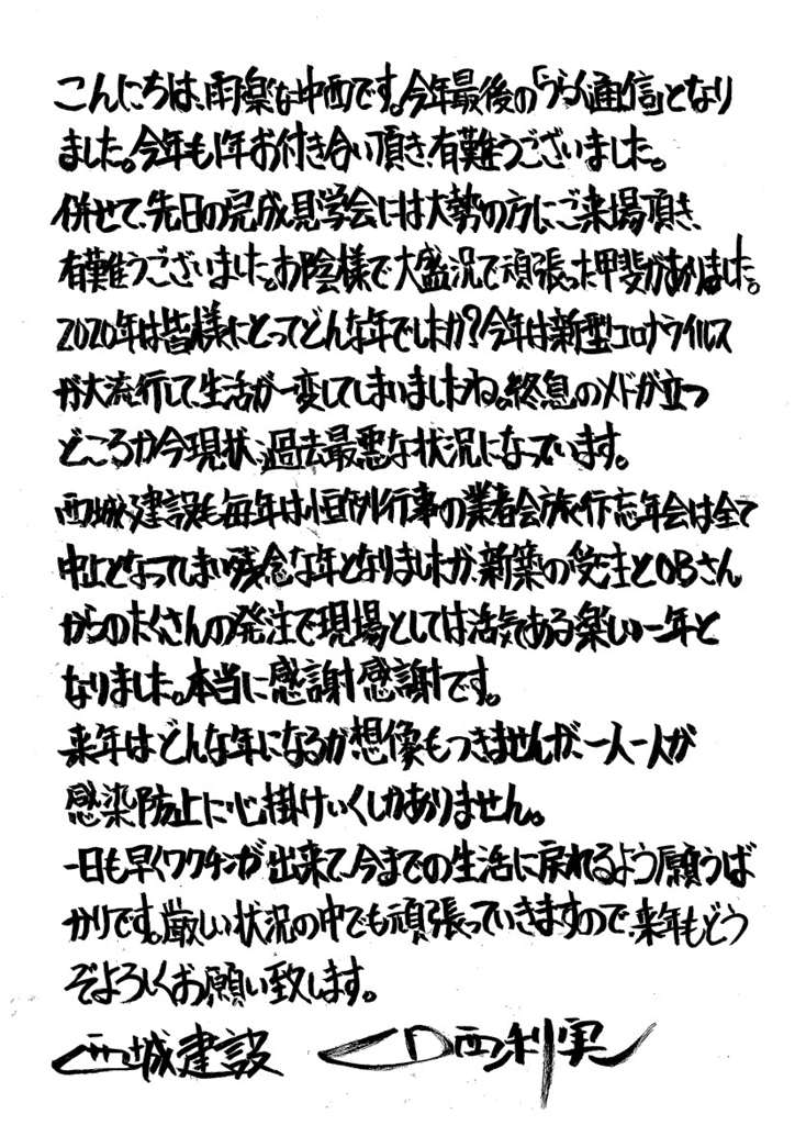 西城建設も毎年恒例行事の業者会旅行・忘年会は全て中止となってしまい残念な年となりましたが、