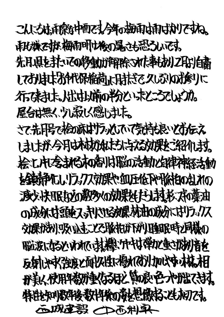 さて、先月号で桧の床はサラッとしていて気持ち良いとお伝えしましたが、