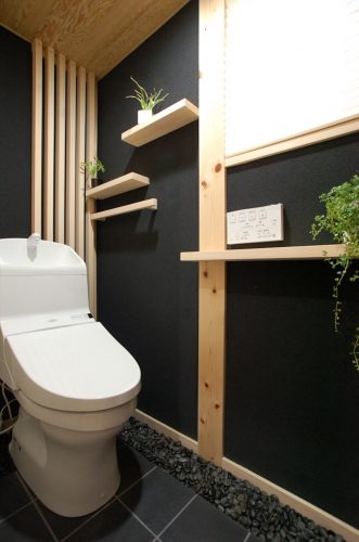 床に黒のタイルを貼り、壁に備長炭を使った和風のトイレ。OBさま宅のトイレの写真をご覧になったK様からのリクエストで、縦格子を取り付け、玉砂利も敷きました。
