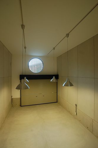 あえてコンクリート打ちっぱなしの無機質な雰囲気としながら、シャッターの上の丸窓に雨楽な家らしさも感じます。