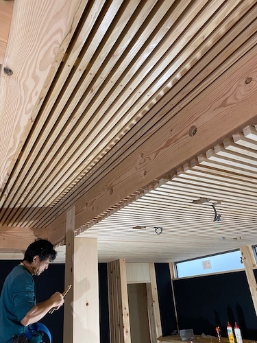 11月28日、29日に見学会を開催するお客さまの家では、細い木を等間隔に並べた格子の天井を採用しています。見上げた先、格子越しには家を守る立派な梁の存在を感じられるはずです。