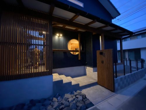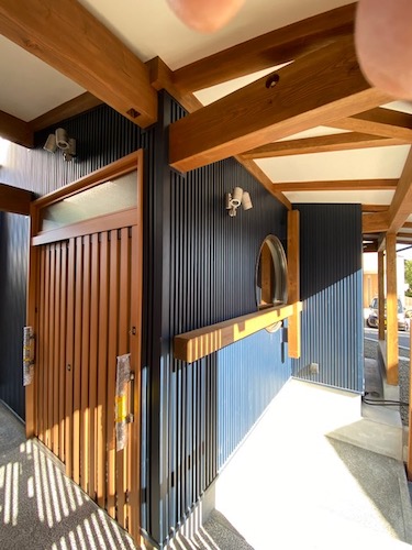 外観は落ち着いた紺色のガルバリウム。純白の軒裏とのコントラストは、どこかお城や蔵のような美しさがあります。