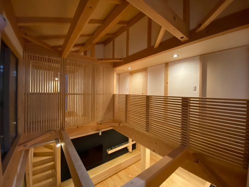 風通しの良い室内空間と、吹き抜けの先や格子越しに家族の気配を感じられるこの家は、大空間の魅力と意匠性の高さが絶妙にバランスした比類なき雨楽な家です。