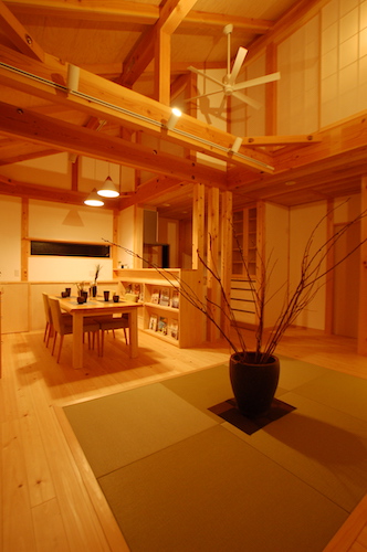リビングにはソファーを置かず、こたつの使用を想定。こたつを置く場所は、目の方向を変えた畳を敷き、見た目の色合いに変化をもたせました。ヒノキの床と畳、相性バッチリですね。リビングの畳、和室の畳は、和紙でできた畳おもてを採用しています。和紙を「こより」に加工して、交互に編み込んでつくる和紙畳。和室だけでなく、さまざまなインテリアに合わせて使用することができそうですね。