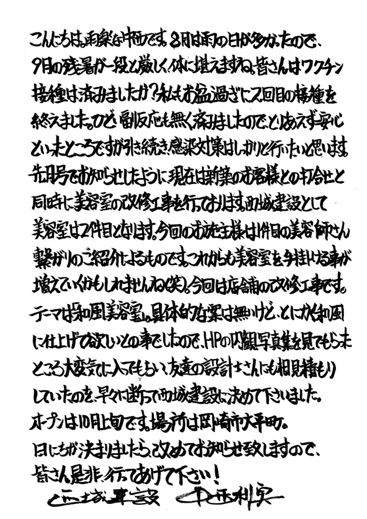 先月号でお知らせしたように、現在は新築のお客様との打合せと同時に美容室の改修工事を行っております。