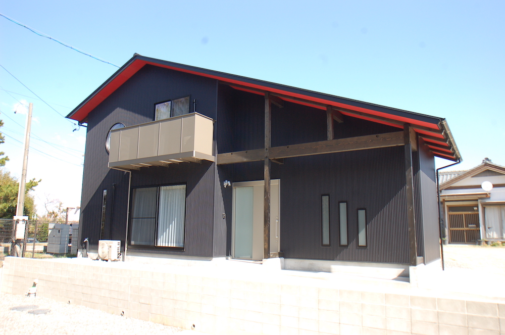 片流れの立派な大屋根が目を引くO様邸。落ち着いたトーンのガルバリウムの外壁とポーチ柱に、軒天の赤色がアクセントになったメリハリの効いた外観が印象的です。