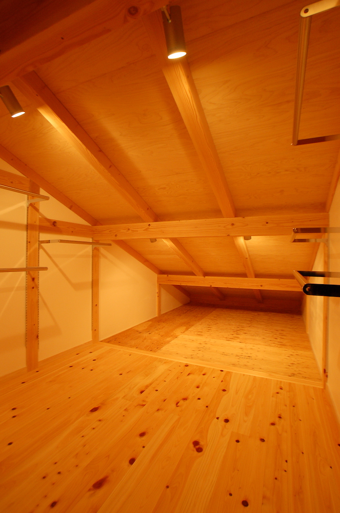 2階のウォークインクローゼット(WIC)は、雨楽な家の特徴でもあるロフトと片流れ屋根をうまく利用。定番となった寝室のWICでも個性を発揮します。