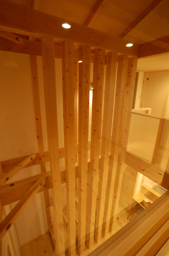 圧巻は階段の列柱。5寸の通し柱を7本立てることで、吹き抜けの開放感、空間の広さが、より一層強調されています。