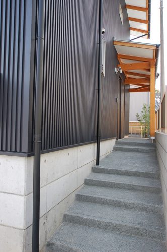購入した土地には高低差があったのですが、アプローチに低い階段を設けることで、それを感じさせないよう工夫しています。