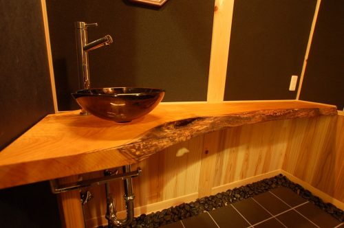 手洗いの天板に用いた耳付きの無垢板も、和の雰囲気をより一層高めます。
