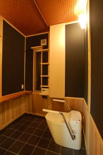 トイレは、天井に「あじろ」を貼って真ん中にさくらの木を据えた茶室を思わせるつくり。