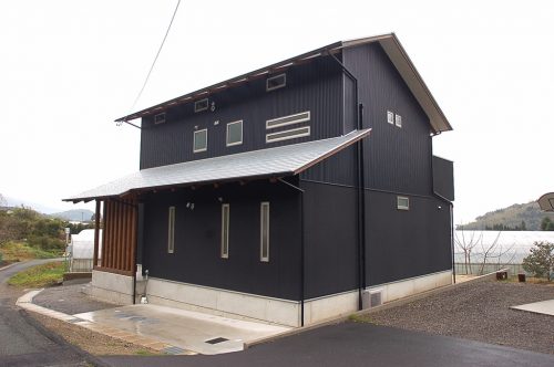 外壁はサイディングとガルバリウムの張り分けが特徴的。同系色ながら、異素材の組み合わせで、独特の質感に仕上がりました。