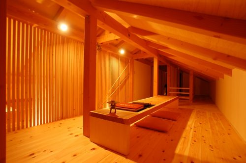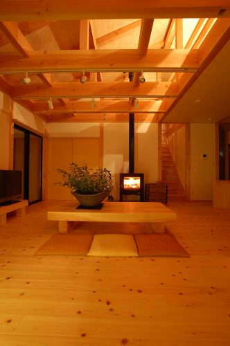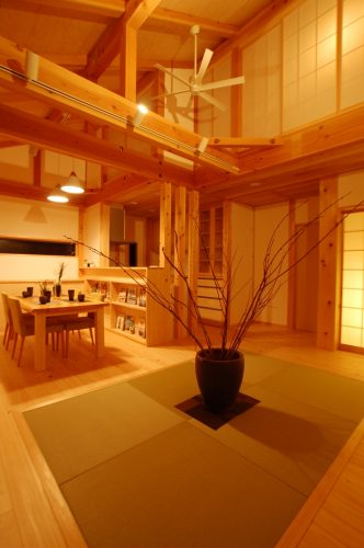 日本伝統の木架構構造(柱などの垂直材と、梁などの水平材で構成される建築構造)が見えるのは雨楽な家の大きな魅力ですが、