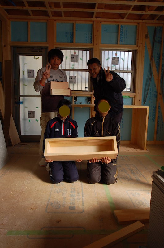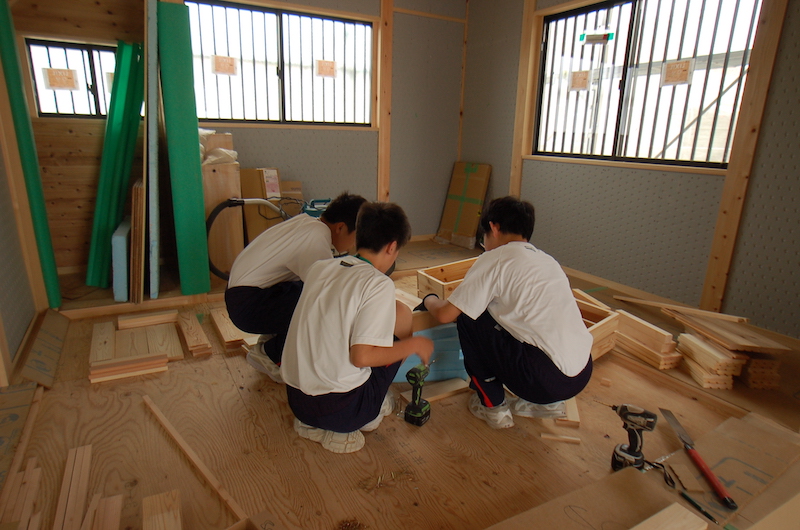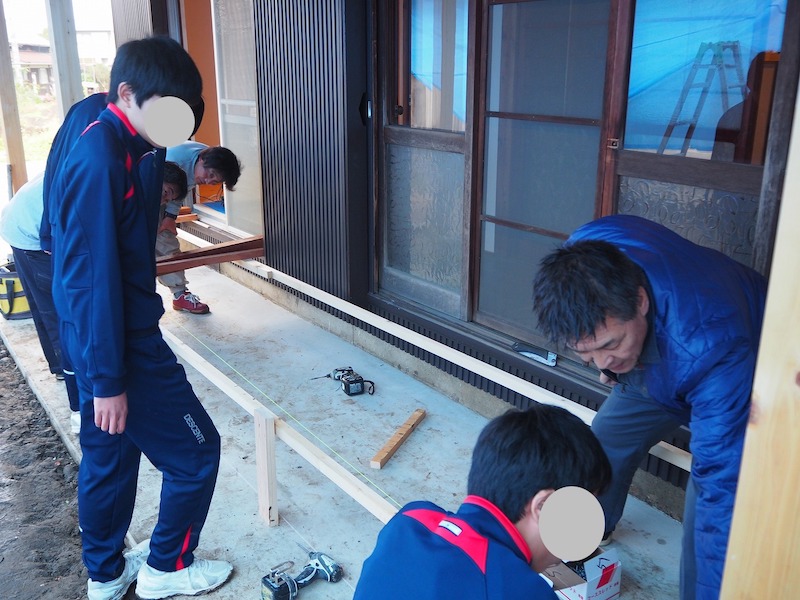 職場体験を受け入れているのは、岡崎市立竜南中学校に通う2年生の生徒たち。2014年から毎年、2~3人の生徒に3日間、建築の現場を体験してもらっています。家づくりの現場で職人の仕事を見たり、実際にお施主様が使う家具を製作したり。ある年は、最終日にお施主さまご夫婦も加わり、皆で一緒に作業したこともありました。