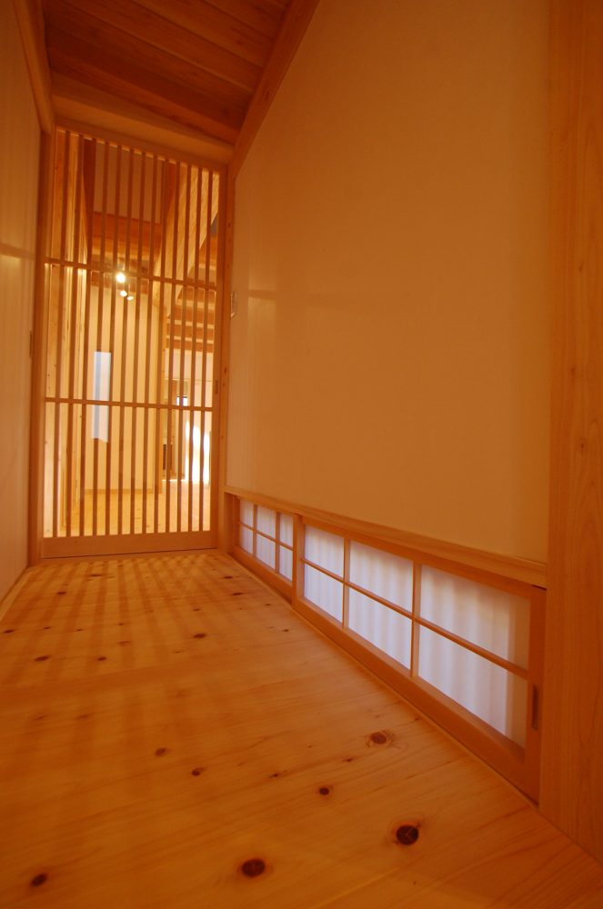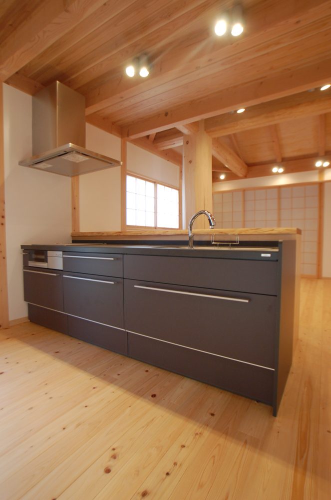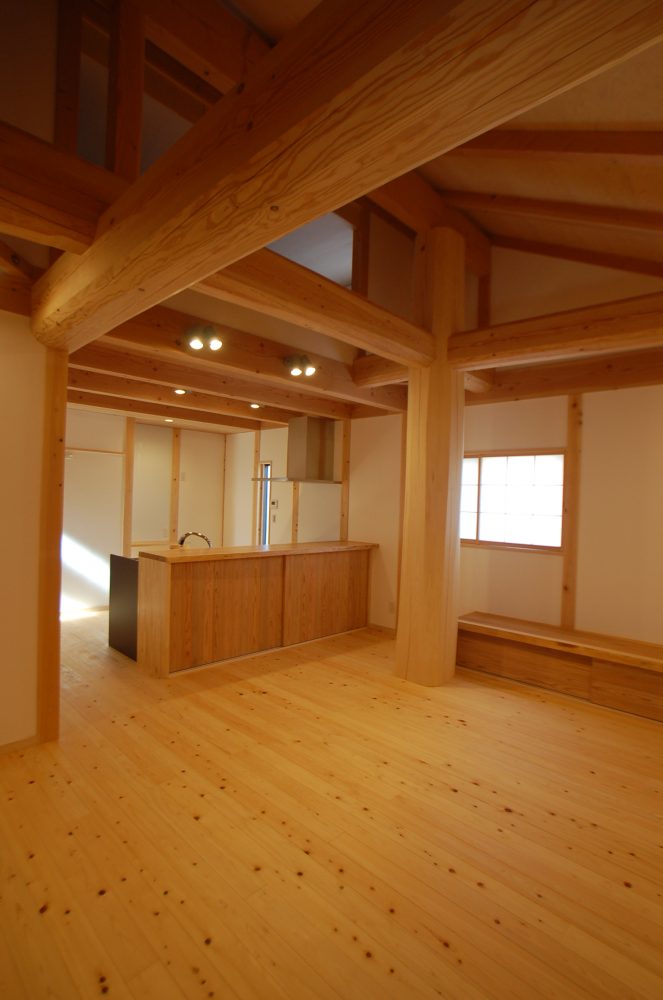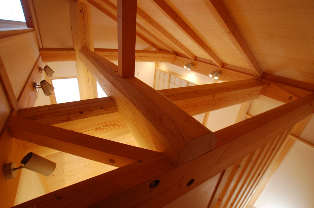 雨楽な家らしい木架構構造(柱などの垂直材と、梁などの水平材で構成される建築構造)の美しさを見せつつも、古民家の雰囲気が融合したこれまでにない家。