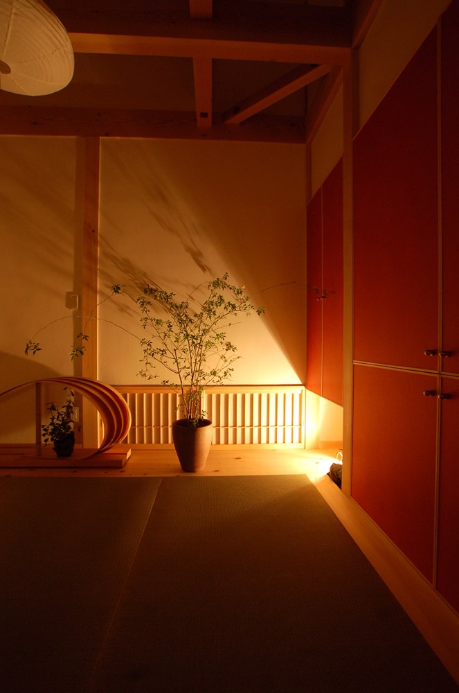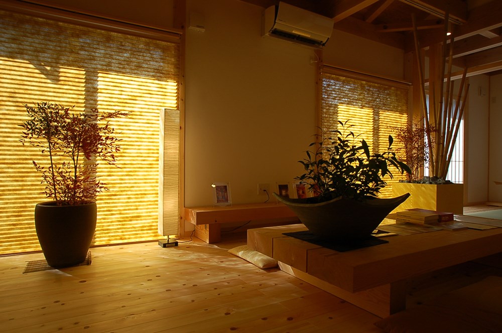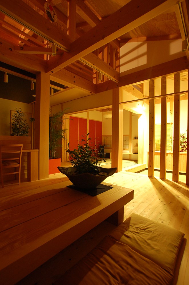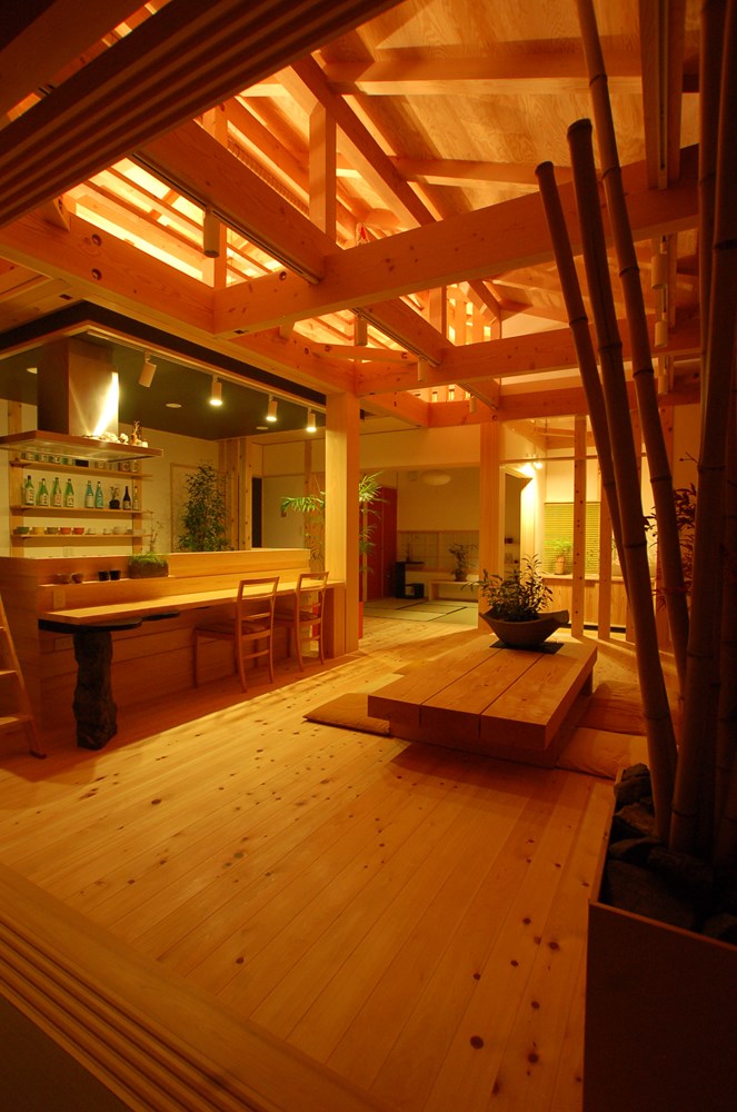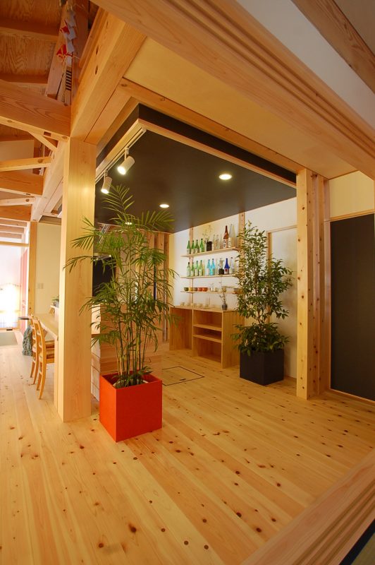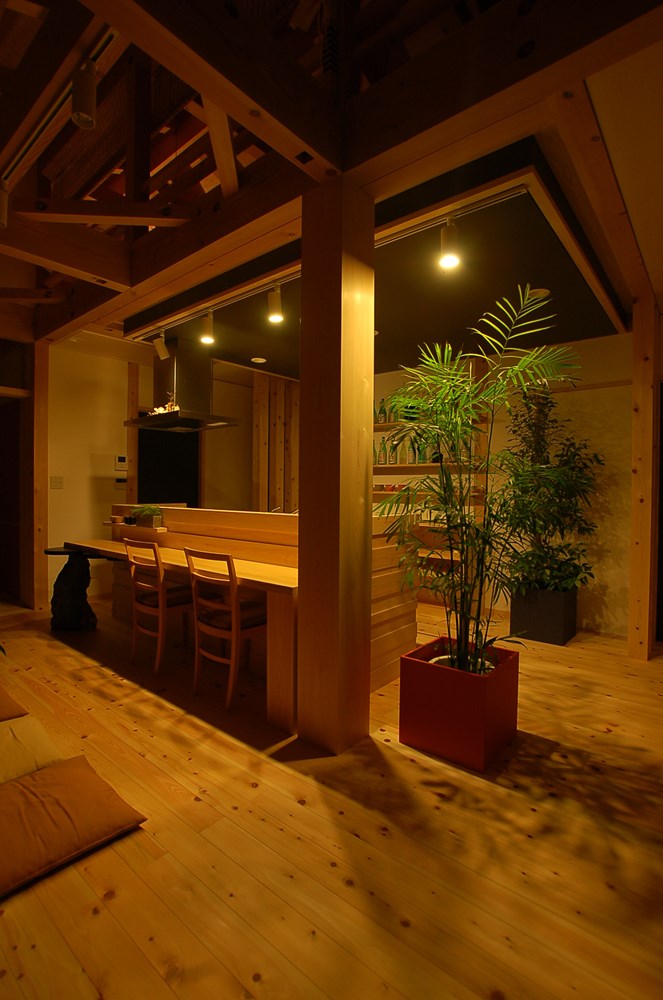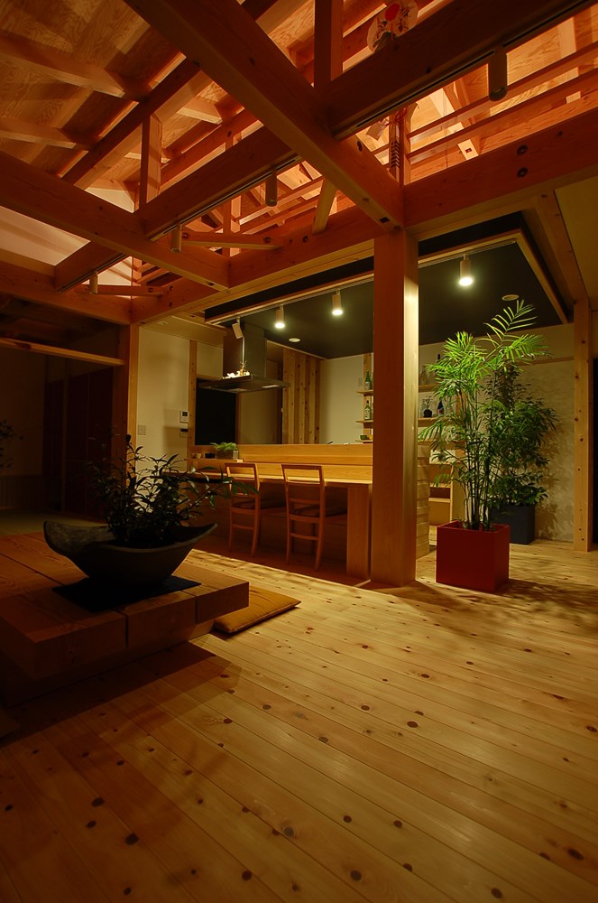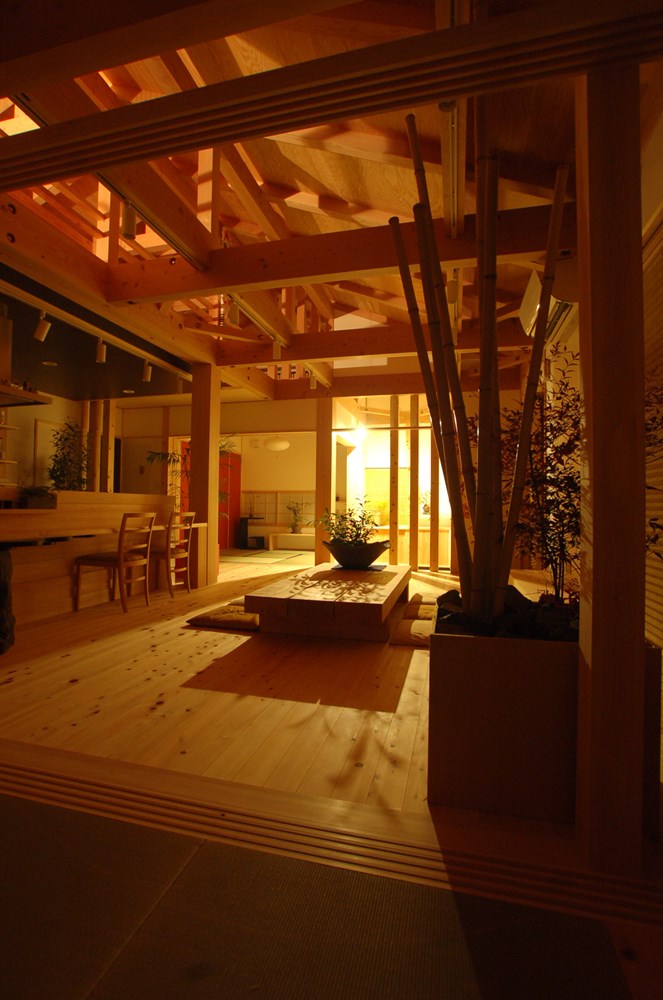 天井には竹や杉などを採用してナチュラルテイストに。12帖のリビングと連なり、より一層広がりのある空間です。