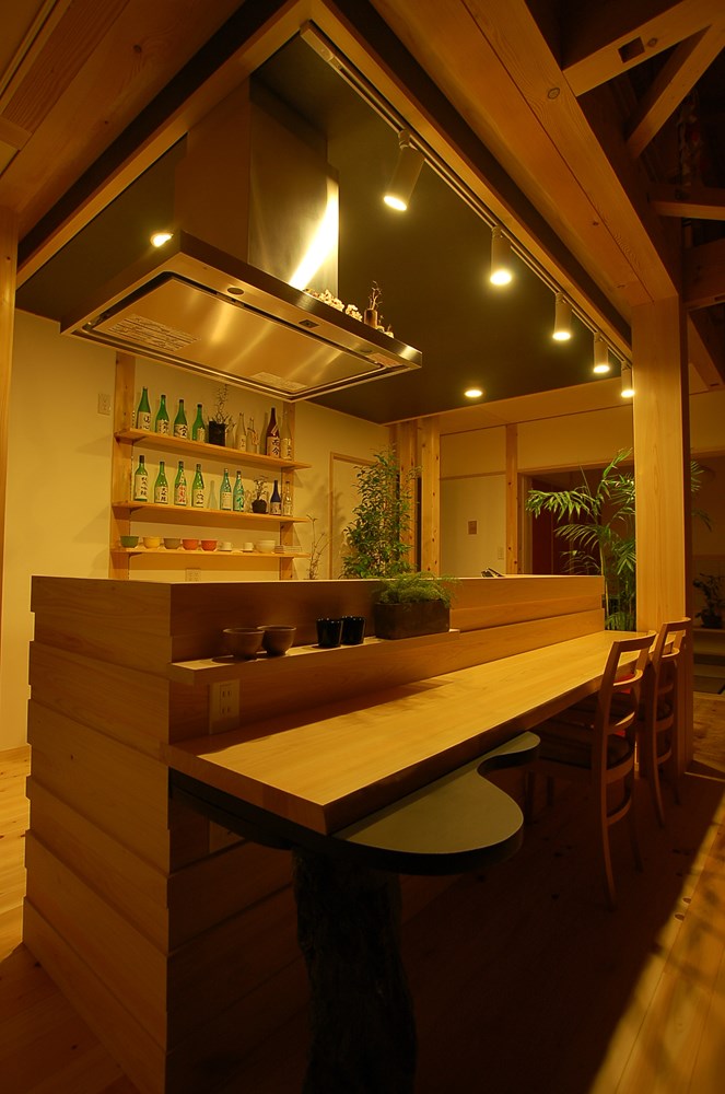 前面にはカウンターを、後方には棚を設けて、お酒や器を並べてあります。
