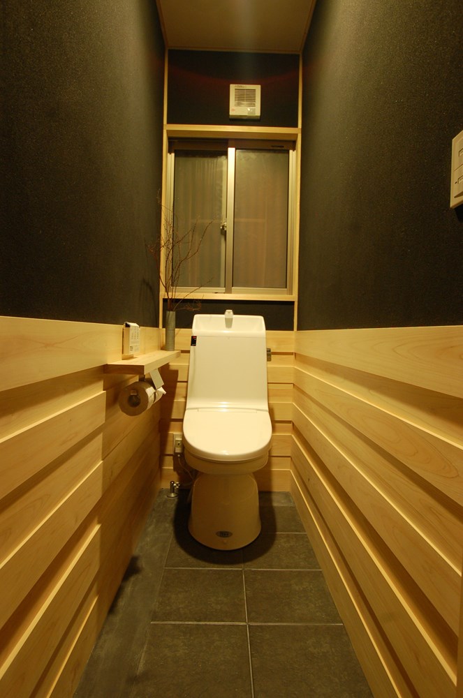 トイレには無垢材の腰壁を設置。上部には備長炭を採用して、快適な空気環境を整えてあります。機能性とともに、デザイン性にも優れたシックで落ち着きのある空間にまとまりました。