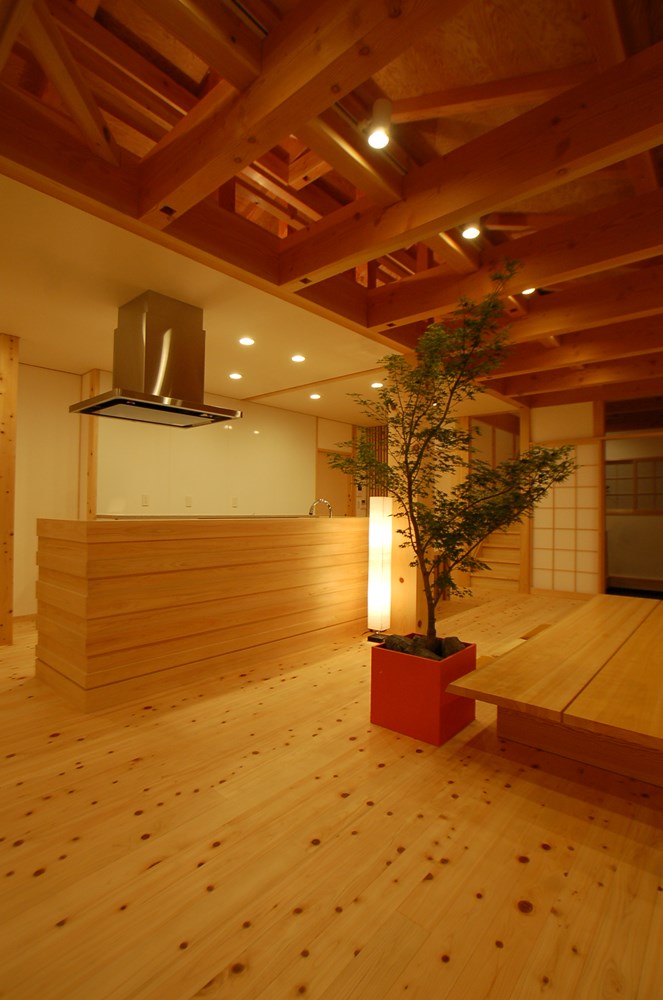 キッチンは動きやすいアイランド型で、背面はヒノキ貼り。キッチンと繋がりのあるダイニングテーブルは無垢板を採用しました。