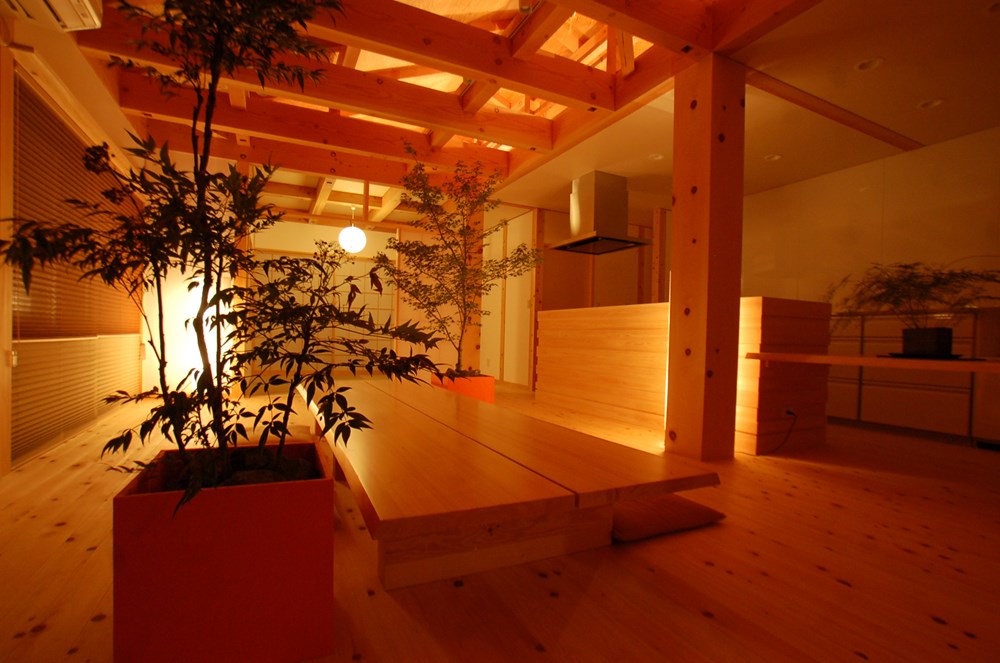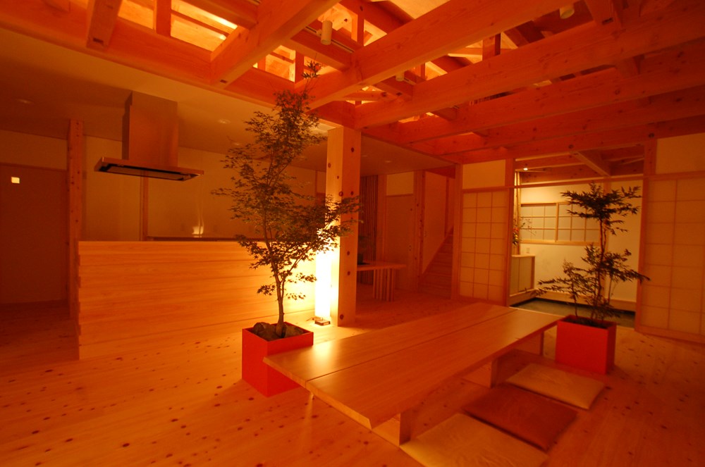 リビングのテーブルは、3メートル×1メートルのヒノキの無垢板を使用しています。トイレの腰壁にもヒノキを採用。